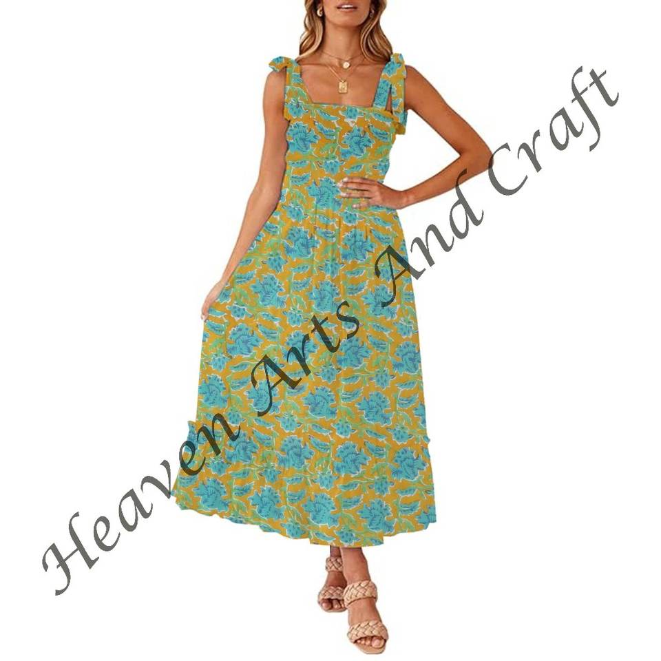 Casual Regular Sleeveless Printed Women Spaghetti Strap Dress Hand Block Printed Casual Wear Kurti Style Spaghetti Strap Dress