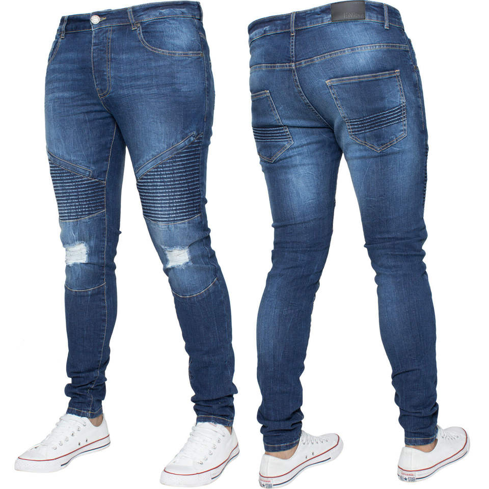 Casual Streetwear Men Baggy Jeans Pants Straight Leg Distressed Washed Blue Denim Hip Hop Style with Button Decoration