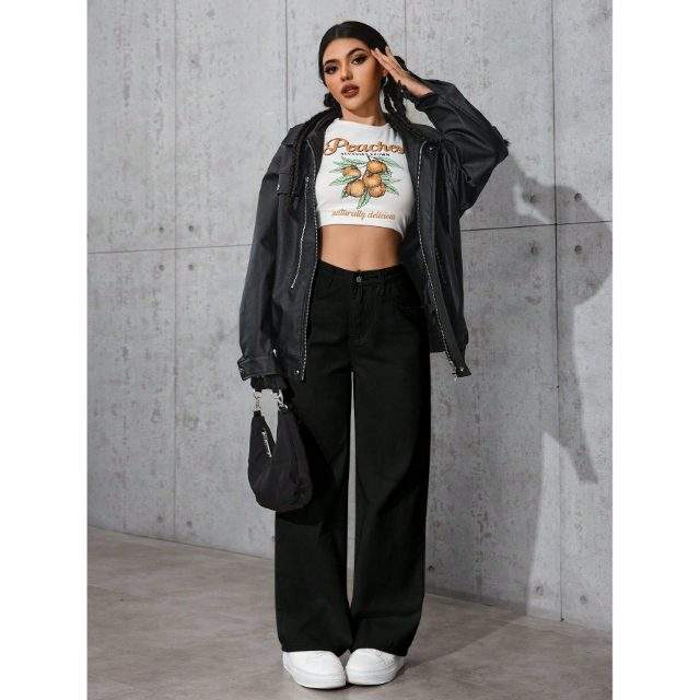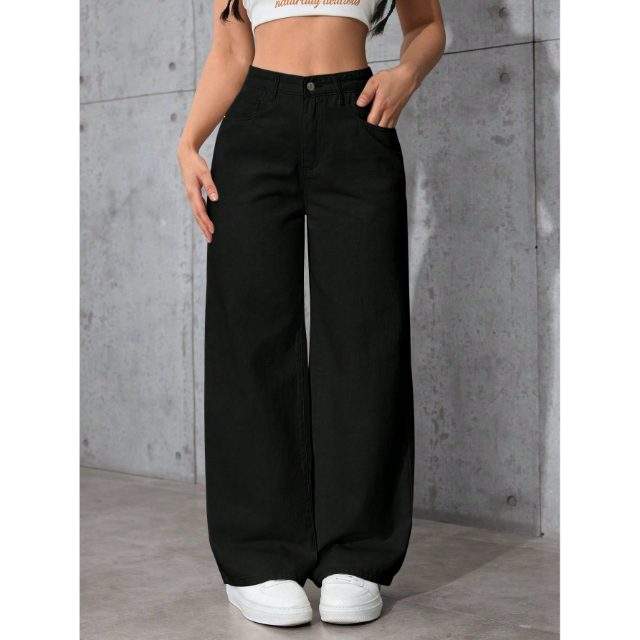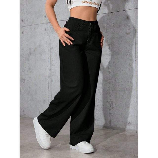 Casual Wideleg Black Denim Jeans Soft Stretch Fabric Ecofriendly Highwaist Relaxed Fit Trendy Street Style Plating Durable Sizes