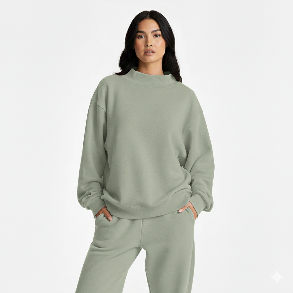 Casual Women Oversized Solid Pattern Fleece Mockneck Sweatshirt Winter Relaxed Fit Pullover Streetwear Front Logo Eco-Friendly