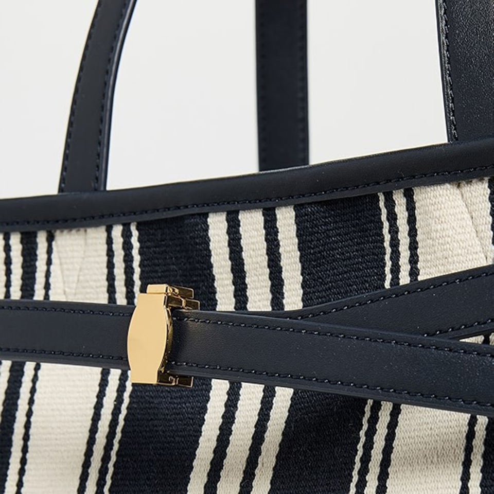 Casual Women's Striped Canvas Tote Bag Custom Logo Leather Trim Shopping Shoulder Bags Travel Weekender Cotton Canvas Handbags