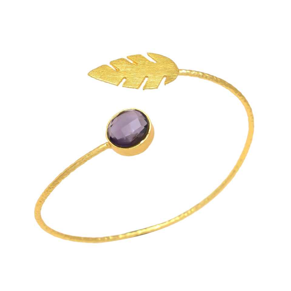 Casual and Sporty Leaf and Amethyst Hydro Gem Cuff Bracelet for Woman and Girls, Gold Plated Big Leaf Design Bracelet