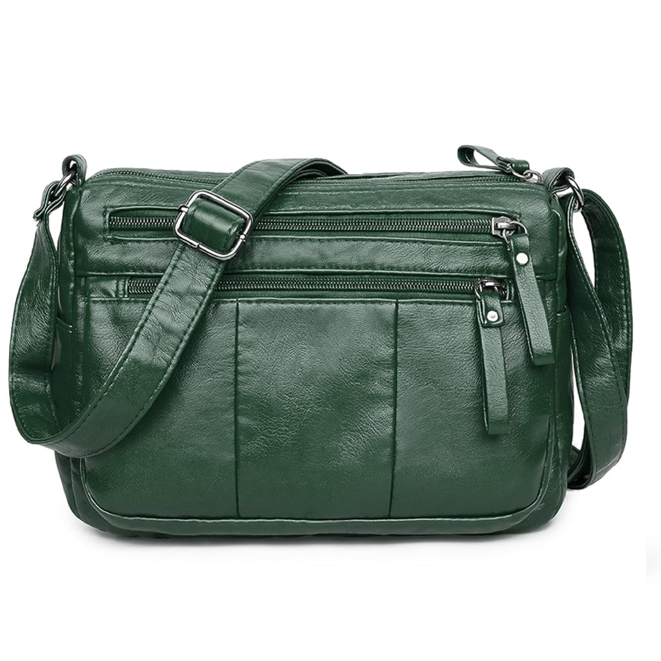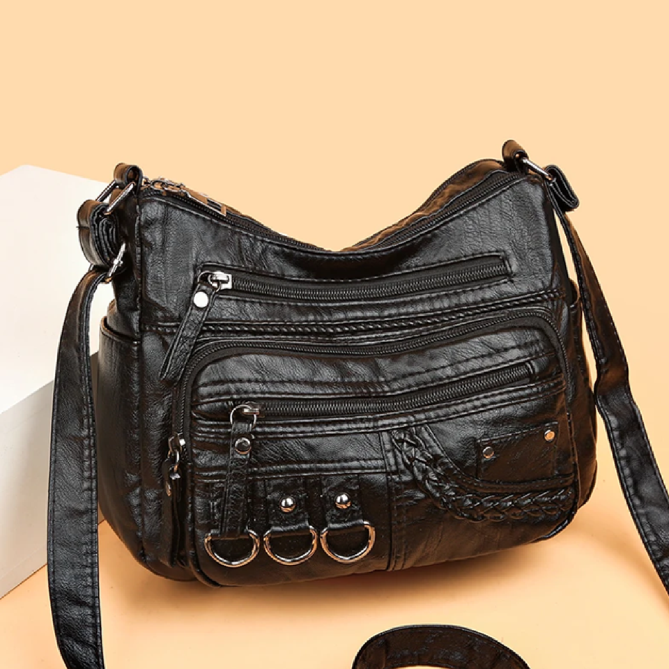 Casual black leather crossbody bag with multiple front zipper pockets and decorative ring pulls, a functional and stylish purse