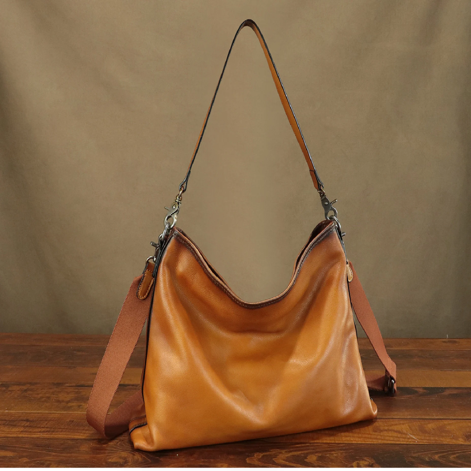 Casual brown leather hobo bag with a soft shape, a wide shoulder strap, and a detachable long strap, available at wholesale
