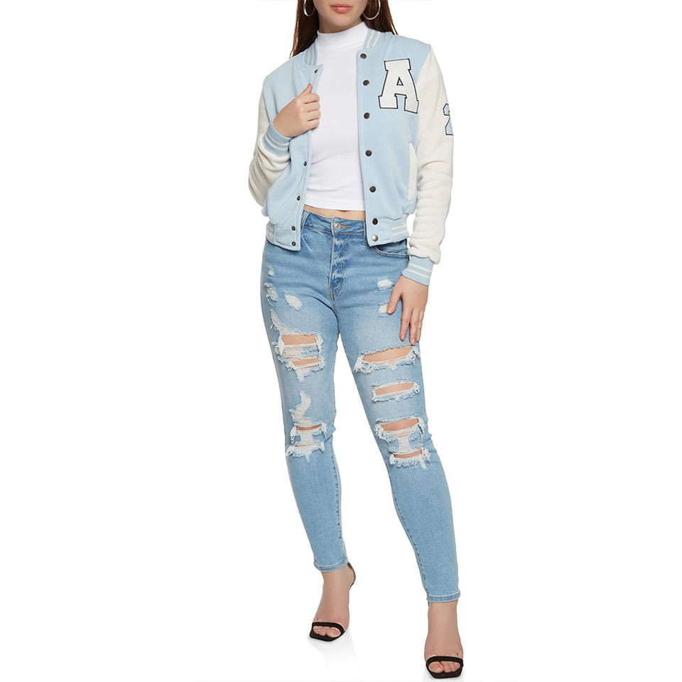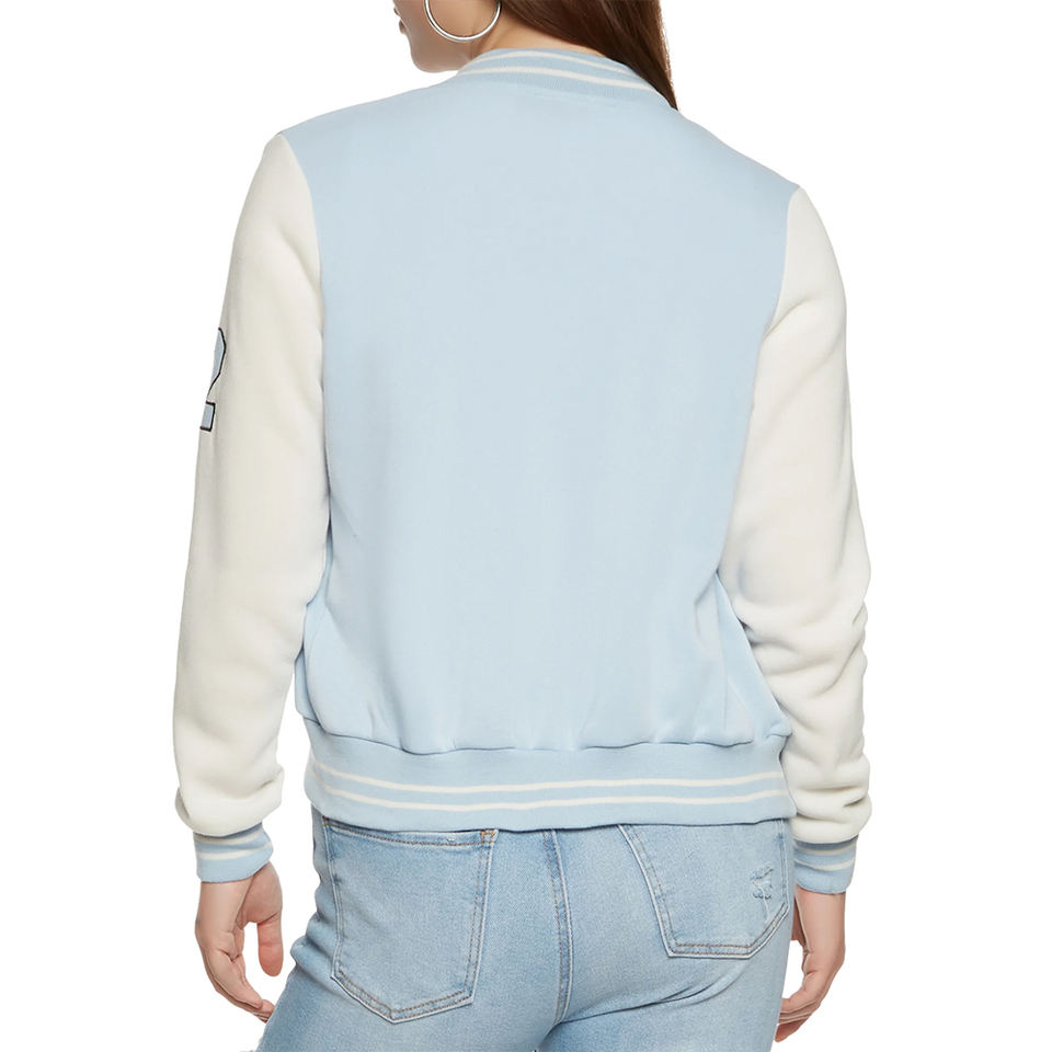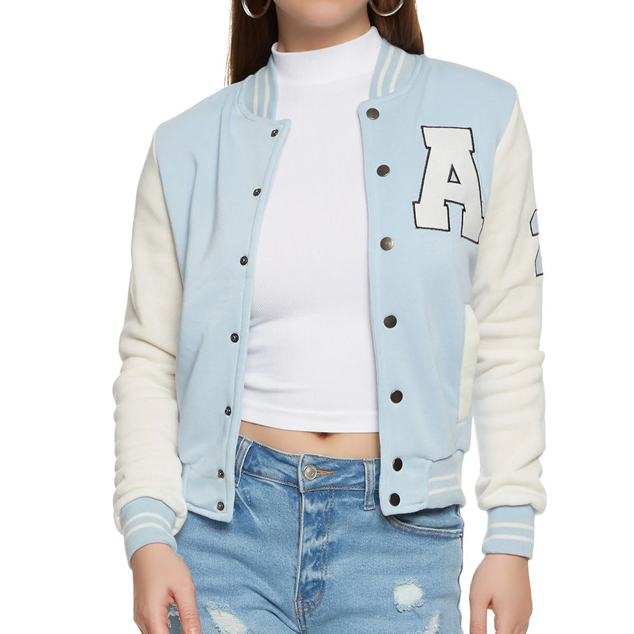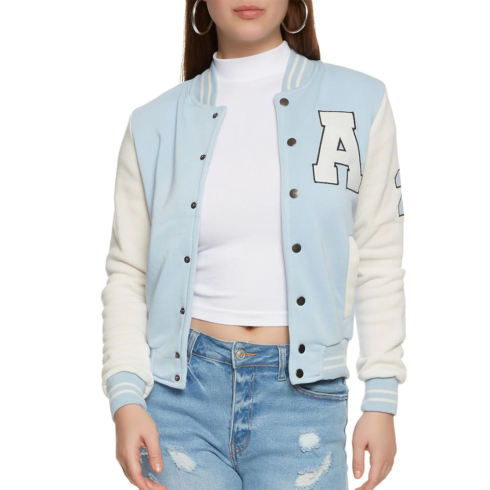 Casual women varsity jacket with ribbed collar cuffs and offering comfort warmth and timeless sporty style for everyday wear