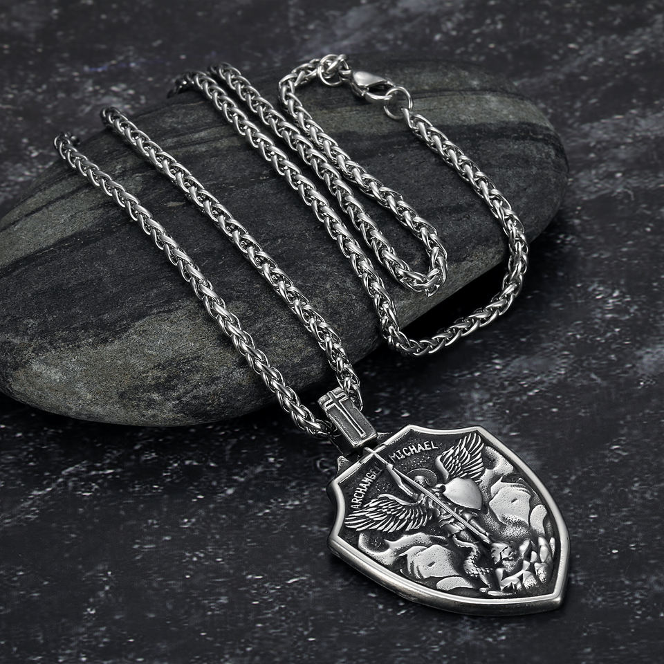 Catholic Archangel Saint Michael Cross Shield Shape Stainless Steel Pendant Necklace Men Women ST Michael Protect Us Jewelry