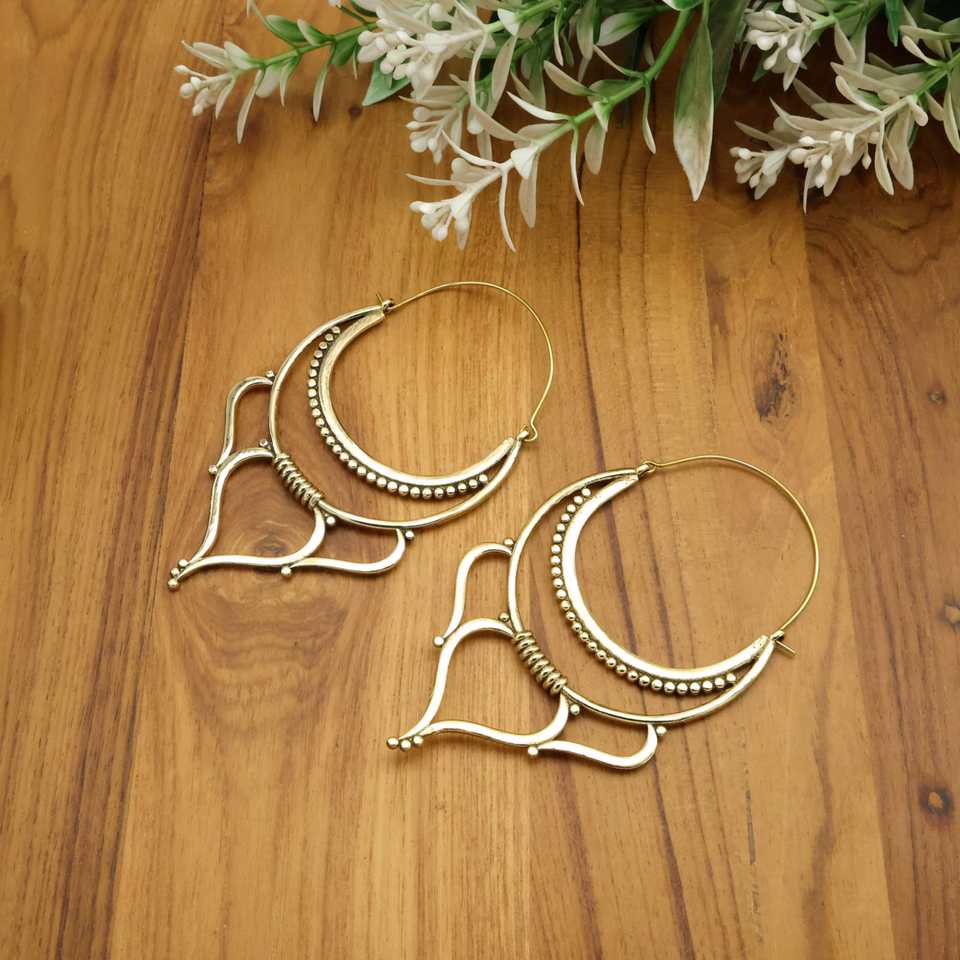 Celestial Moon and Lotus Hoops, Big Golden Boho Earrings, Witchy Goddess Jewelry, Ethnic Statement Earrings, Gift for Her