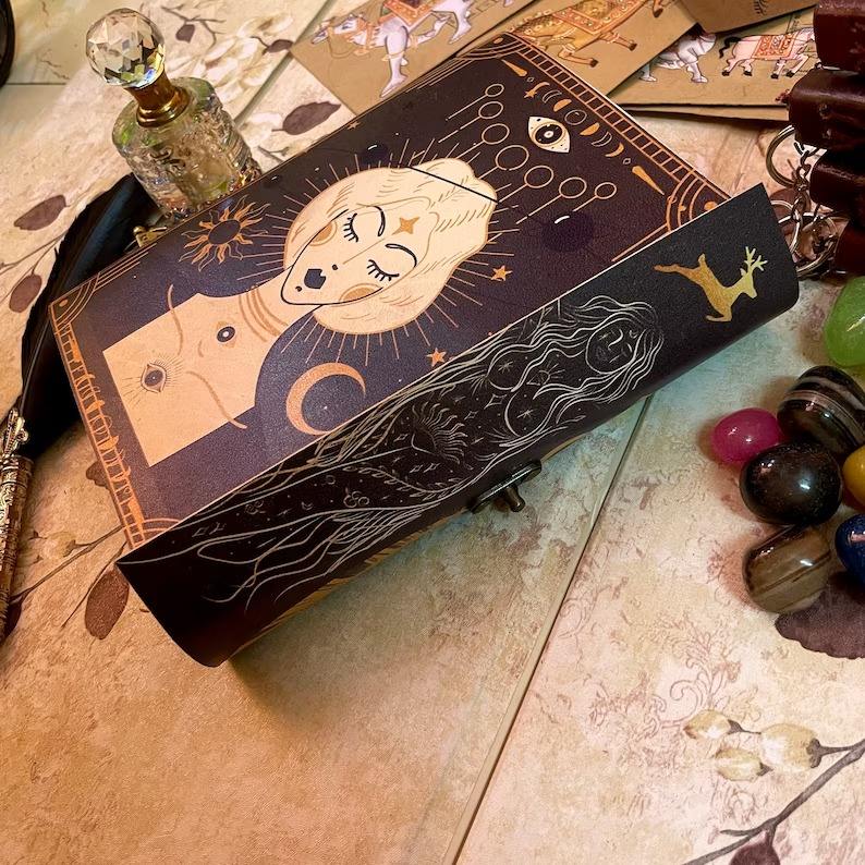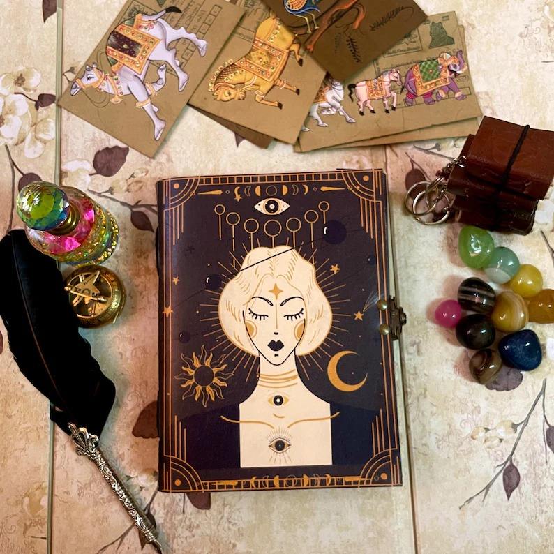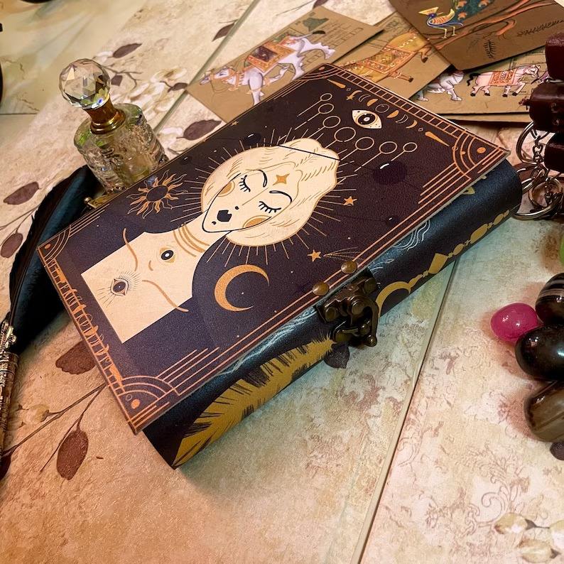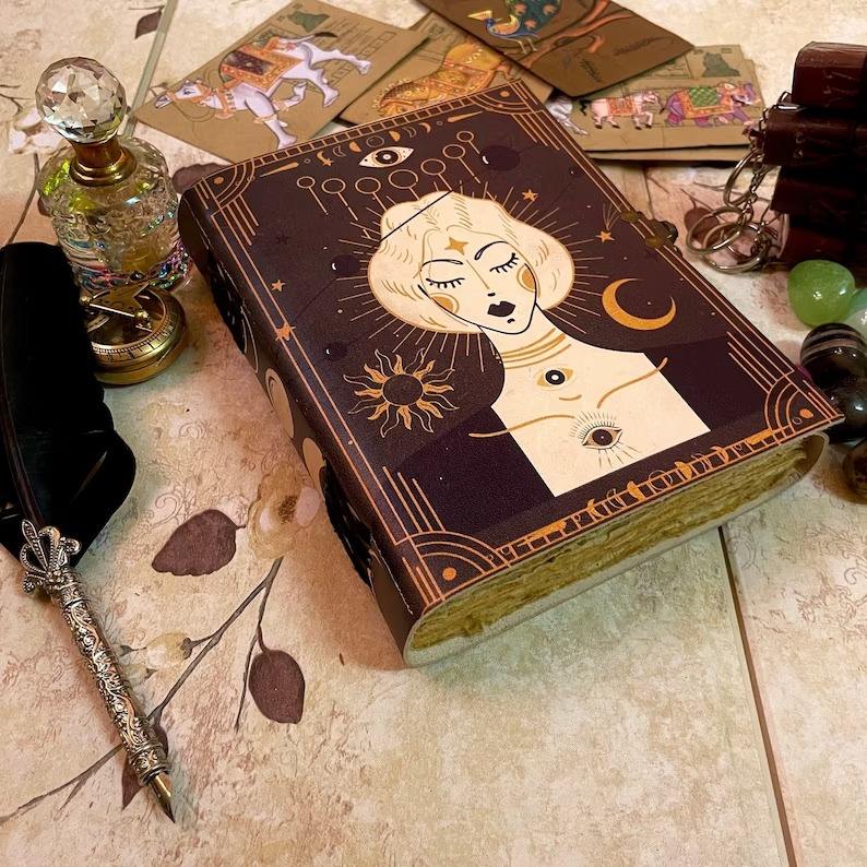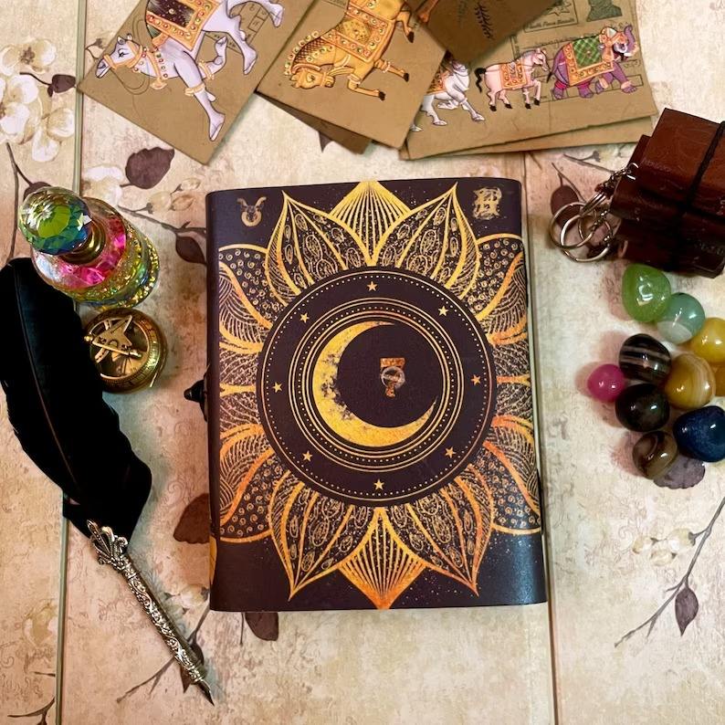Celestial Sun & Moon Leather Journal 8x6 Both Side Grimoire Spell Book Shadows Deckle Edge Paper Thread Sewn Binding 200 Pages
