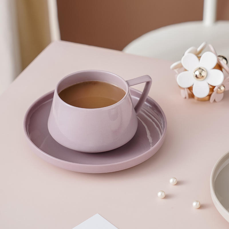 color:Beige coffee cup and saucer, pinkish-purple coffee cup and saucer