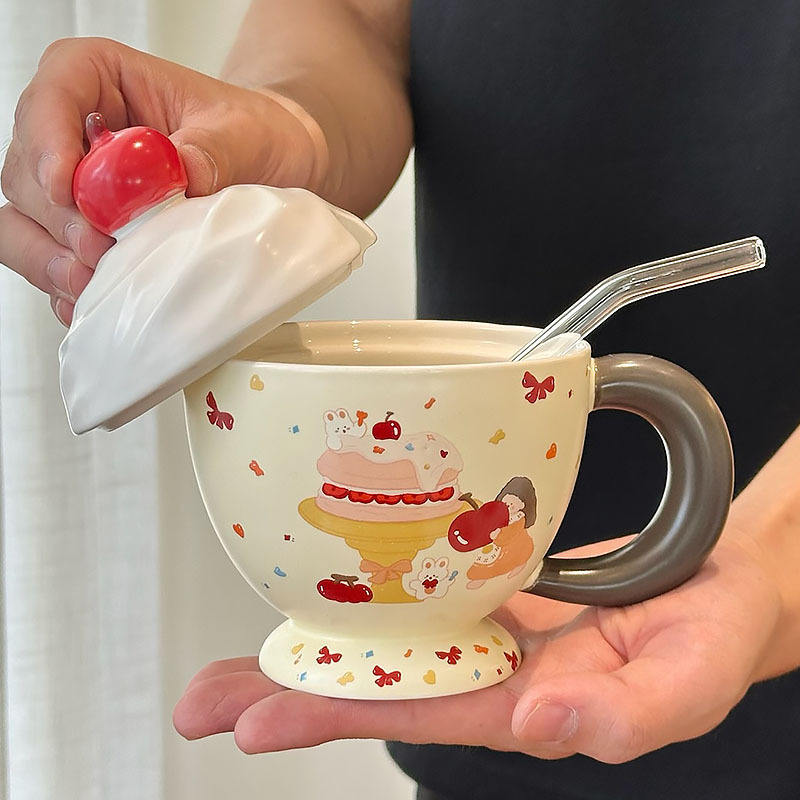 Ceramic Mug With Lid And Spoon Cartoon Pattern For Home Office Use Gift For Women Single Cup Set