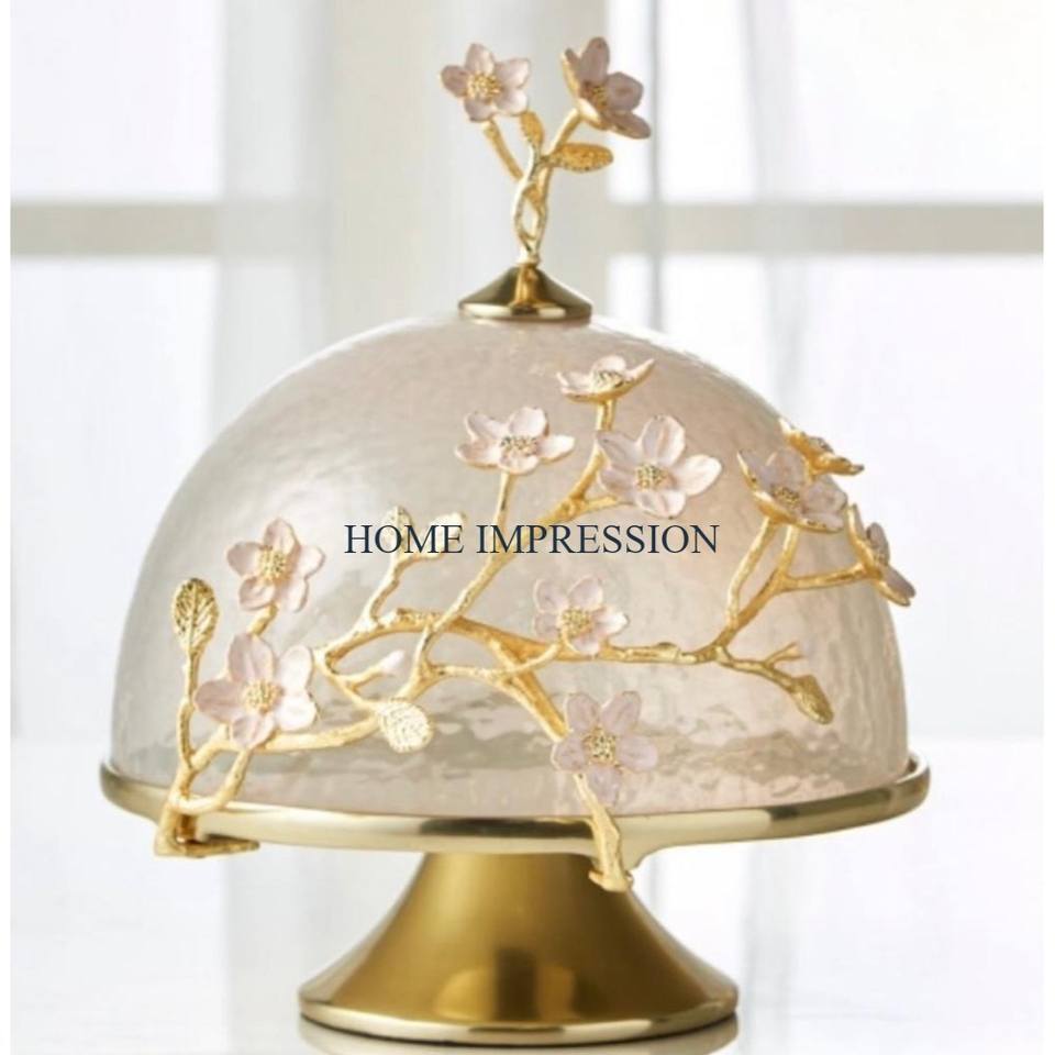 Ceramic Stylish Luxury Designing Large Cake Stand Metal Gold Polished Table Top Decorating Hammered Cake Stand With Wooden Base