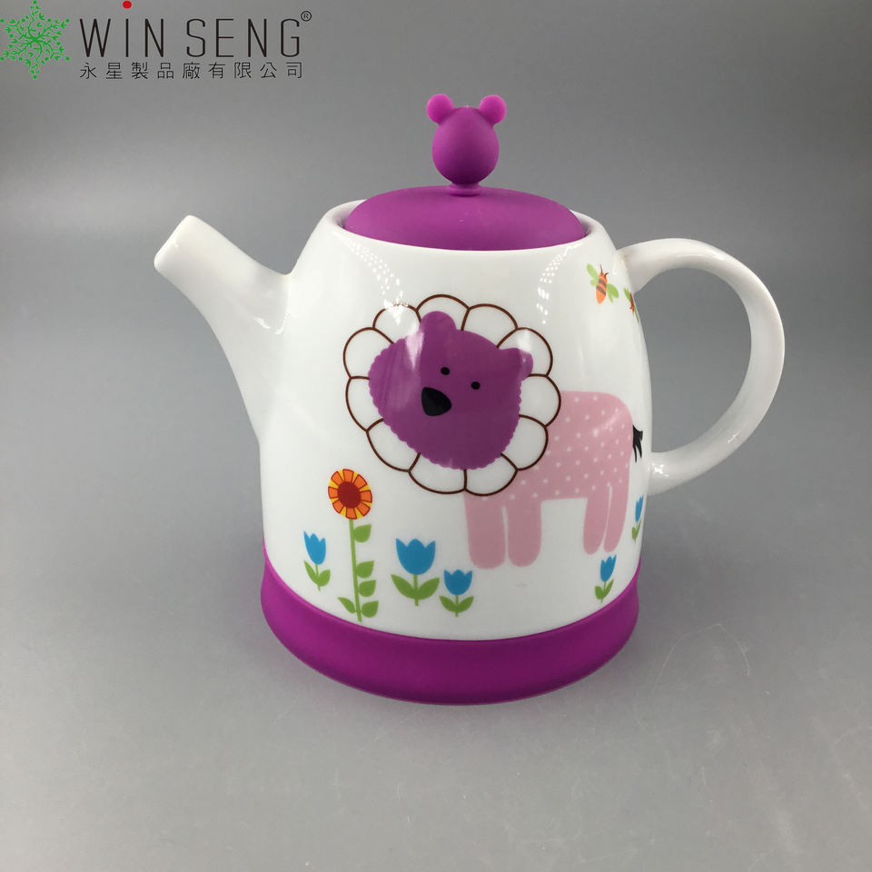 Ceramic Teapot With Silicone Lid, Cute Animal Pattern, China Teapot for Afternoon Tea or Coffee, Purple