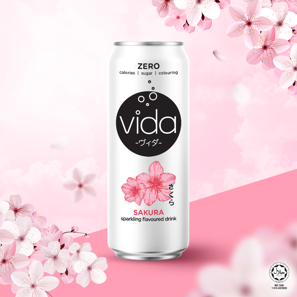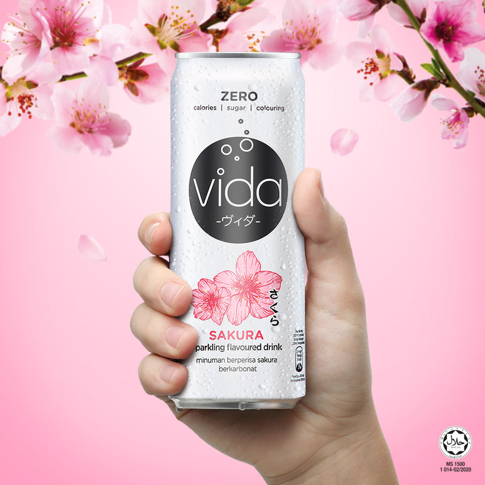 Certified Halal Sugar-Free Fruity Sakura Flavored Carbonated Sparkling Vitamin C Zero Calories Zero Fat 325ml Can Vida Carbonate