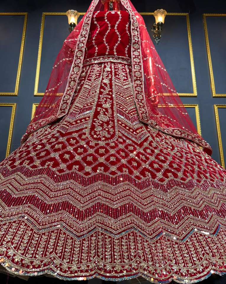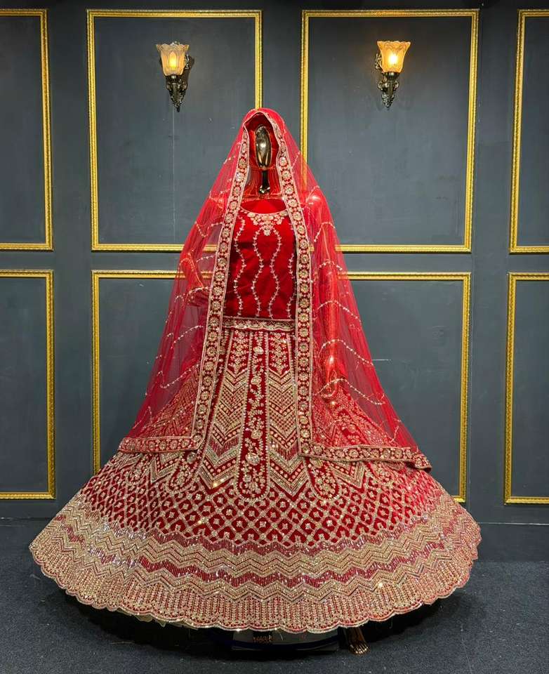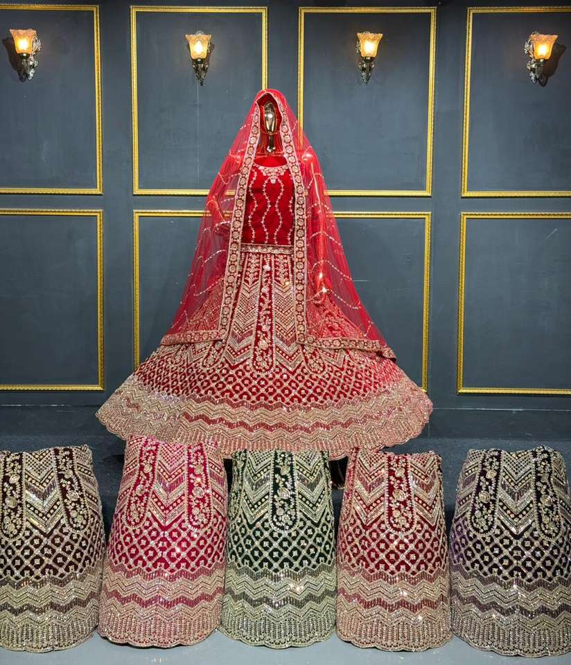 Certified velvet heavy bridal lehenga with full new work full bits work big flair and six colors for weddings and festive wear