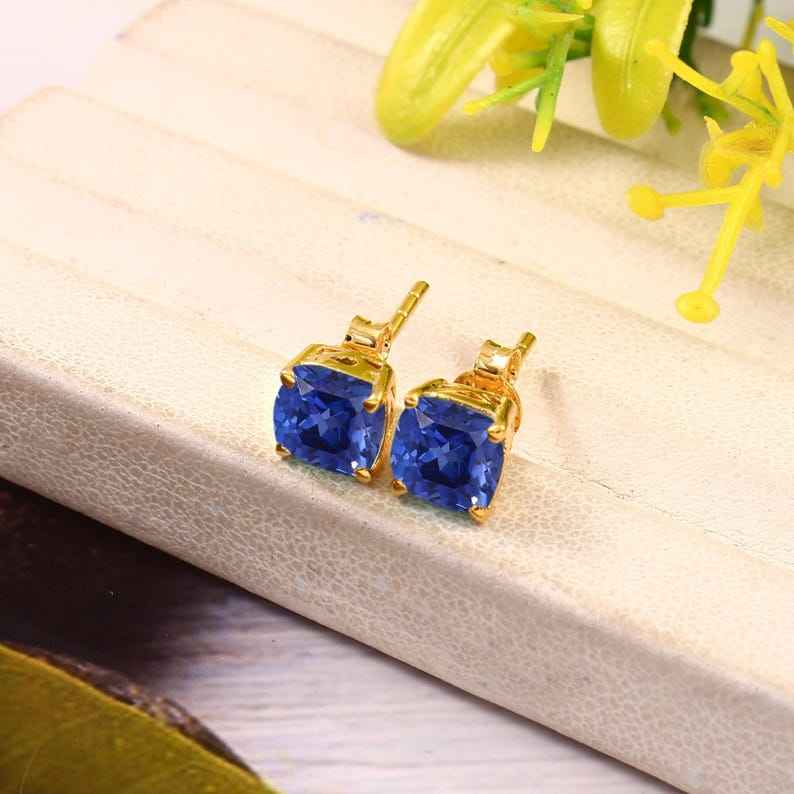 Ceylon Blue Sapphire Drop Earrings 925 Sterling Silver 14K Gold Plated Cushion Shape Luxury Jewelry for Women Party Gift