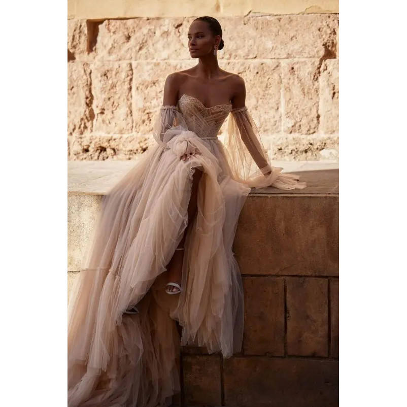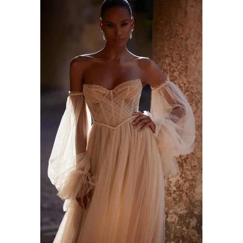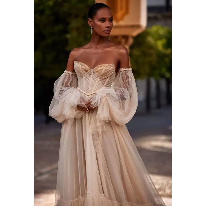 Chamapgne A-Line Beaded Tulle Wedding Gowns