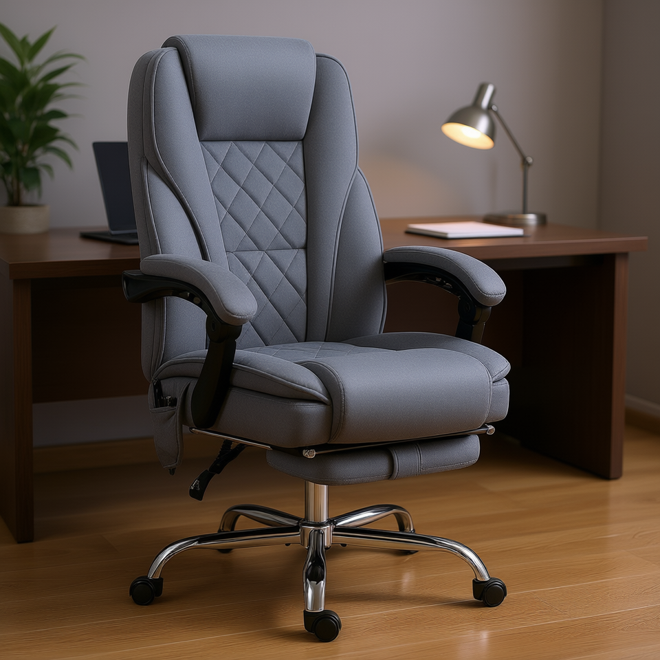 Gray Executive Office Chair With Heated Reclining Adjustable Footrest Swivel Desk Chair Contemporary Fabric Chrome Base