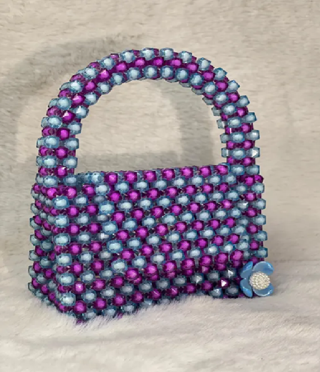 Charming clear crystal beaded bag with a contrasting light blue heart pattern and a long silver chain strap, at wholesale prices