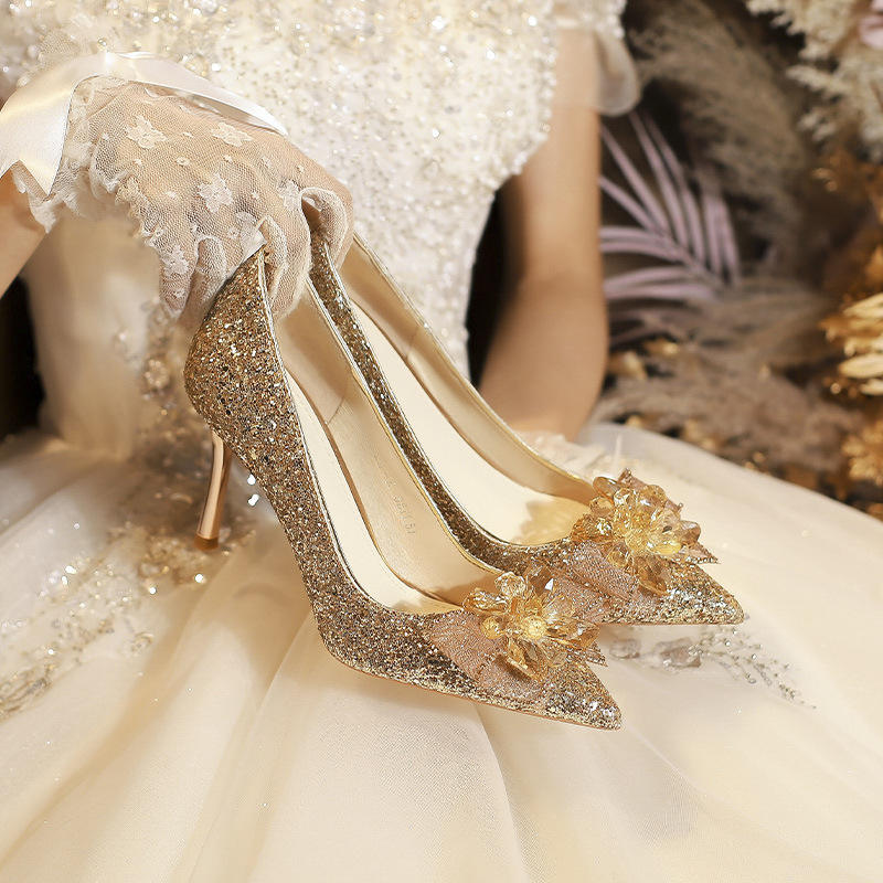 Women's Wedding Shoes Chinese Niche Style Bridal High Heels Light Weight Genuine Leather Upper Crystal Lace