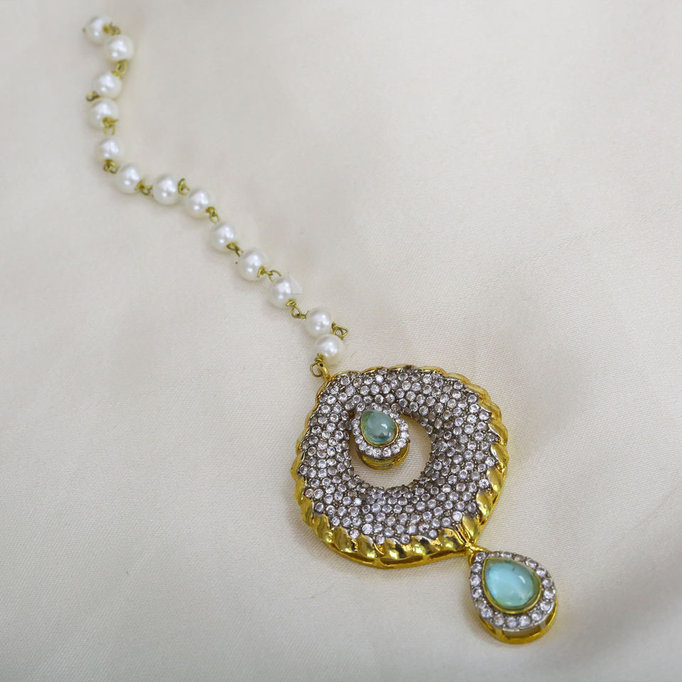 Gold Silver Plated Necklace Set CZ Light Green Zircon Including Earrings Tikka for Weddings Engagements Economically Priced