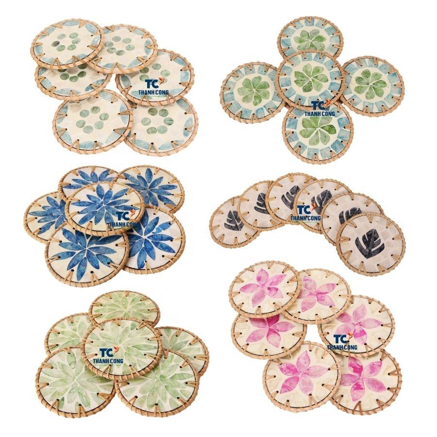 Cheap Price Handmade BLUE FLOWER SHELL COASTERS WITH RATTAN TRIM Rustic Table Decor Eco-Friendly Table Accent Made in Vietnam