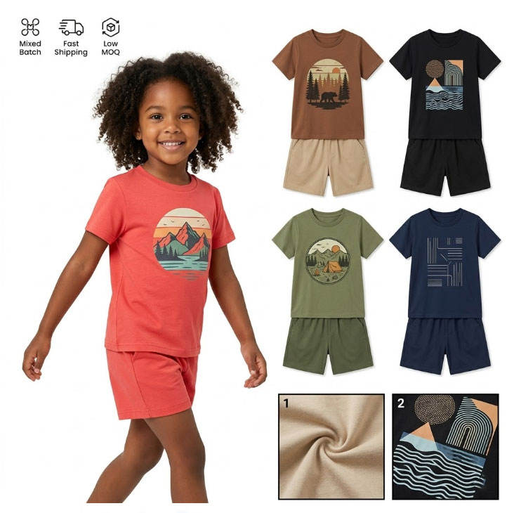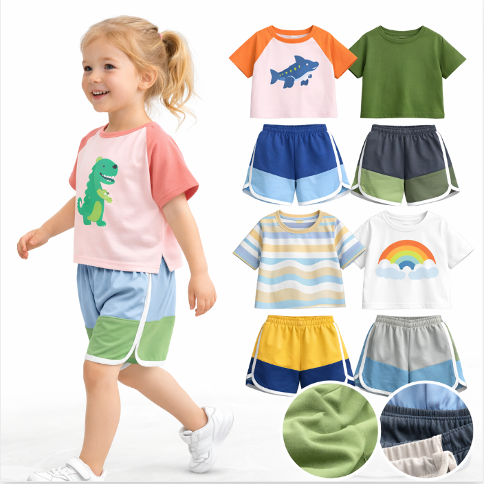Cheap Polyester Mixed Size Kids Summer Sets Assorted T-Shirts Woven Shirts Vests Shorts Children Clothes Bulk Surplus