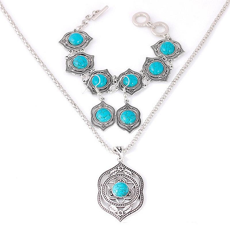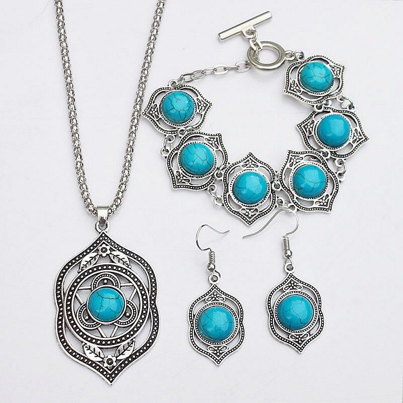 Cheap Western Boho Turquoise Indian Fashion Bohemian Jewelry Sets for Women Earrings Necklaces Popcorn Silver Plated Wholesale