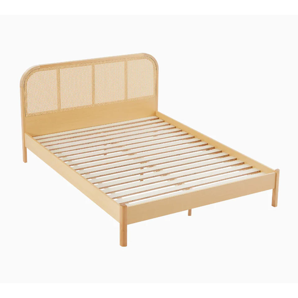 Cheap modern bed frame made of solid teak wood frame with natural rattan on the headboard for indoor bedroom use
