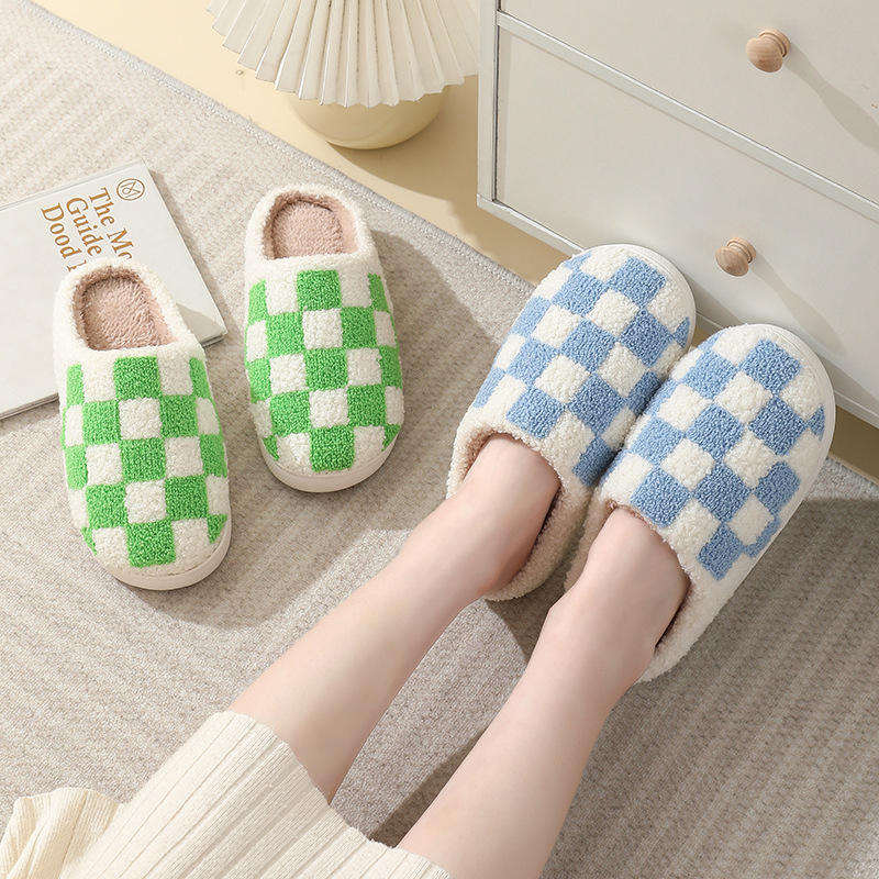 Checkerboard Pattern Fluffy Fur for Slippers Winter Home for Slippers Soft Breathable Cotton Warm Plush with Cushioning Closed