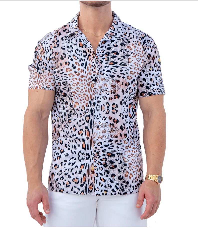 Cheetah Print Short Sleeve Shirt for Men Casual Summer Button Down Collared Animal Print Shirt