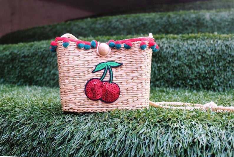 Cherry Pattern Water Hyacinth Handbag Beach Bag Summer Tote Bag and Handbags Female Purses 2023 Made by Vietnam FBA Amazon
