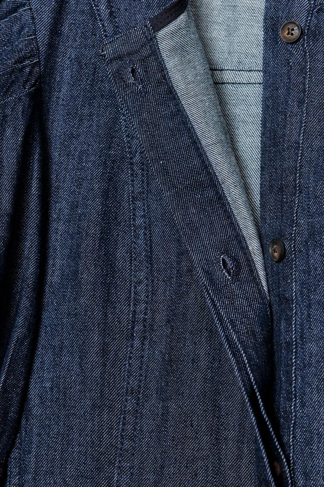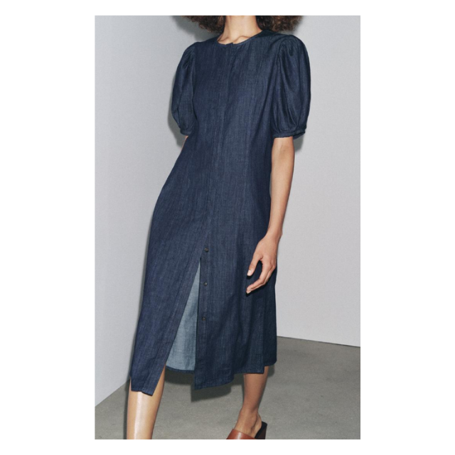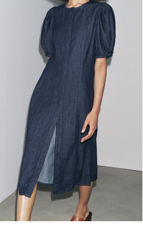 Chic Blue Denim Dress for Women with Puff Sleeve Button Down Slit Flared Hem Midi Length Design in Relaxed Fit Style Outfit Wear