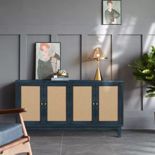 Chic Navy Blue Storage Cabinet with Rattan Doors and Gold Handles Elegant Design for Home or Office Organization