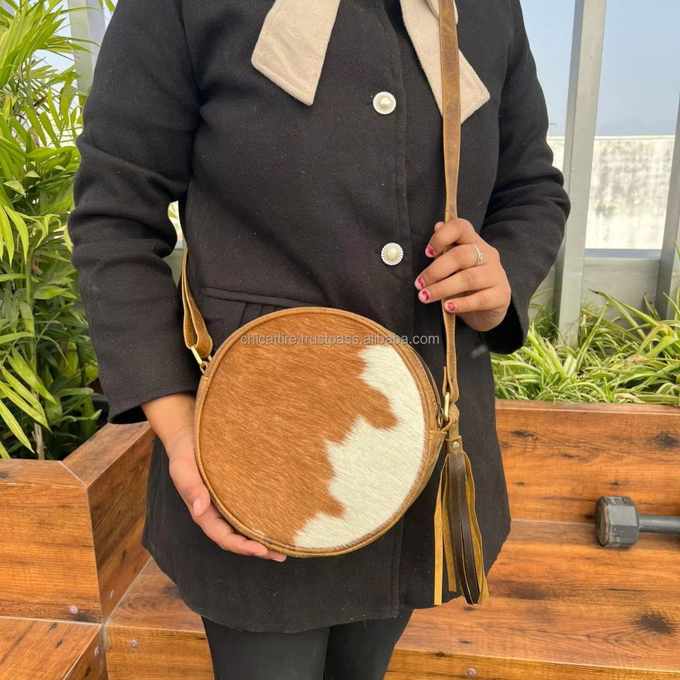Chic Western Inspired Hair-on-Hide Leather Canteen Bag Premium Quality Fur Leather Circular Sling with Tassel & Zipper Closure