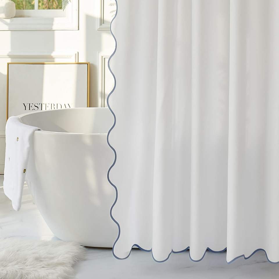 Chic White Fabric 72 X 72 Shower Curtain With Water Blue Scalloped Border Boho Chic Cloth Ideal for Bathroom Showers