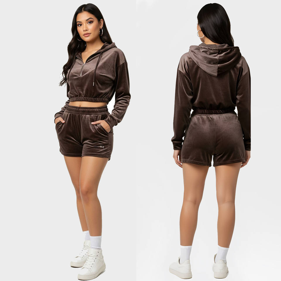 Women's fashion Crop hoodie with Shorts 2 Pcs set Semi-zip design