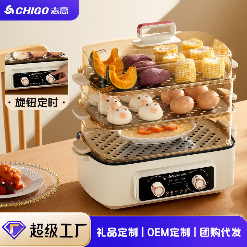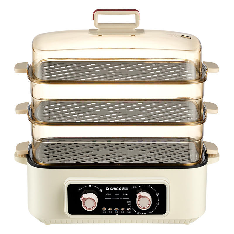 Chigo Electric Steamer Three-layer 10L+ Large Capacity Stainless Steel Cooking Pot With Timer And Tempered Glass Lid