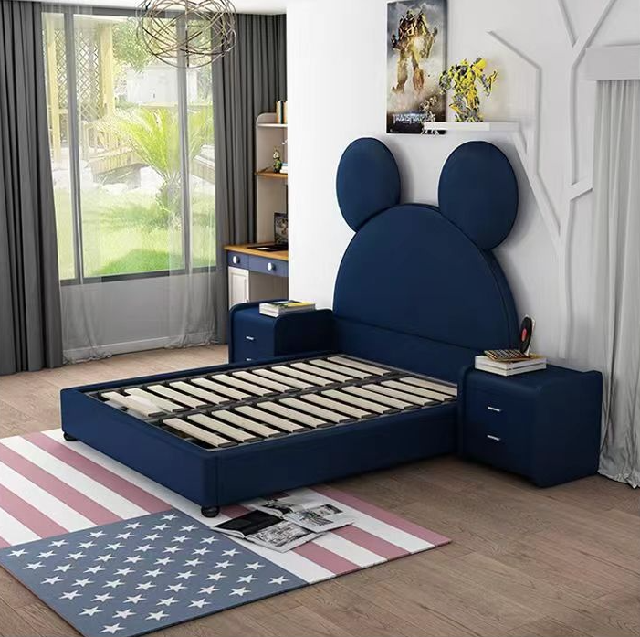 Children'S Bed Customized Colors Genuine or Eco Faux Leather Upholstered Fun Cartoon Headboard Solid Wood Bed Frame With Storage