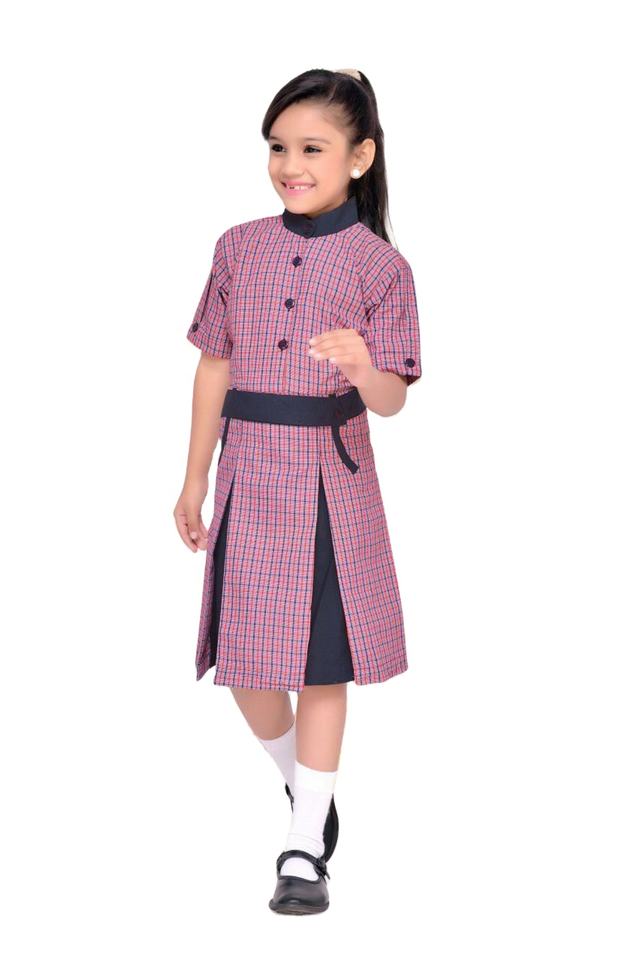 Girls Pink Checks Short Sleeve Pinafore Dress Set Primary School Uniforms for Students Woven Fabric Tops
