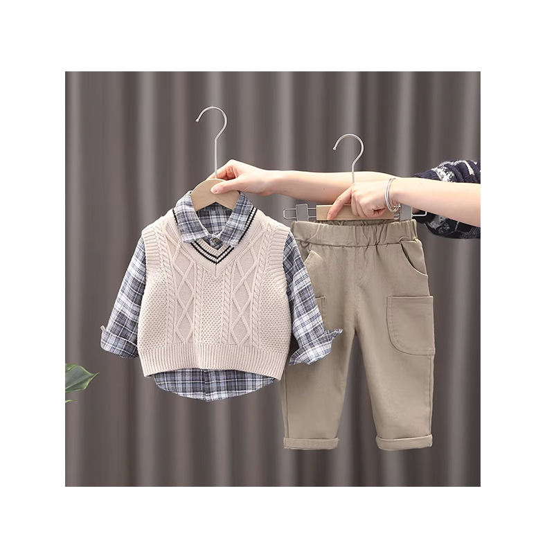 Children's Casual Solid Pattern Three-Piece Set Knitted Sweater Vest Plaid Shirt Long-Sleeved Vest Boys Boys Three Piece Suit