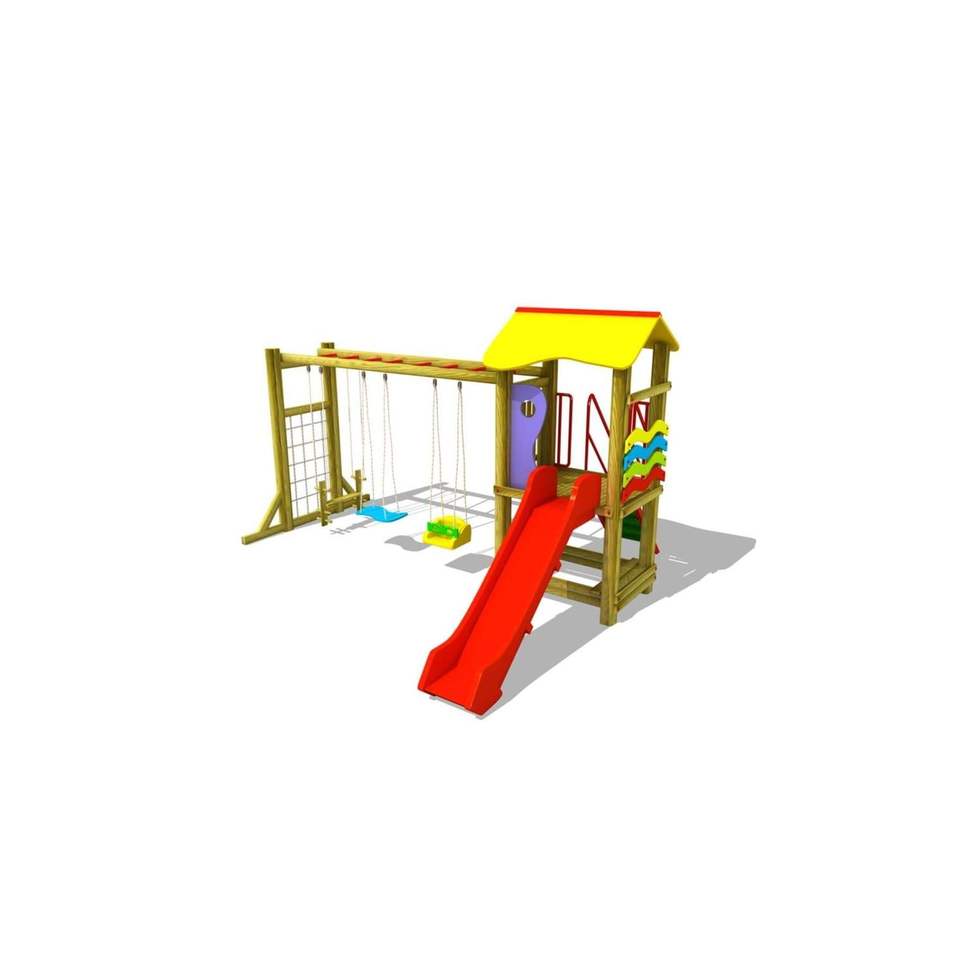 Children's Very Colorful Outdoor Park Set with One Tower Flat Slide and Three Swings Wooden Toys for Ages 1+ in the Sun