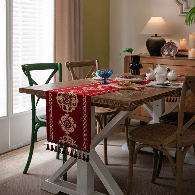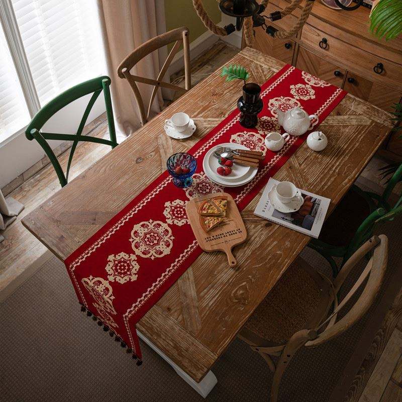 Chinese Festive Wedding Housewarming Red Gold Tassel Household Polyester Tablecloth Table Runner Tailstock Flag Cover Towel