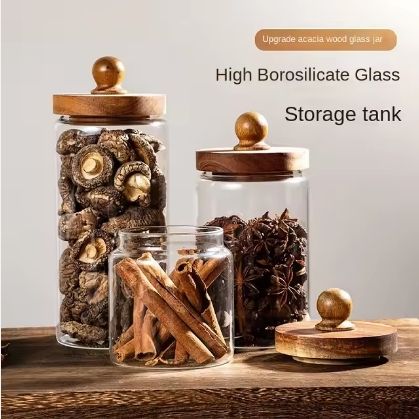 Chinese High Borosilicate Glass Storage Jar Modern Wood-Covered Dustproof Moisture-Proof Seal 600ml-1500ml Capacity for Food