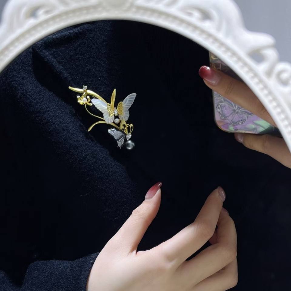 Chinese Style Butterfly Pearl Brooch with Gold-Plated Mother of Pearl Shell Handmade Enamel Craft for Banquet Dress Accessories