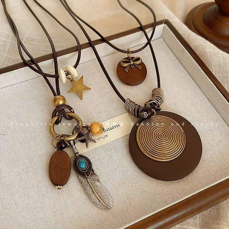 Chinese Style Zinc Alloy Pendant Long Necklace Ethnic Layered Leopard Pattern Geometric Design for Women Four Seasons Fashion