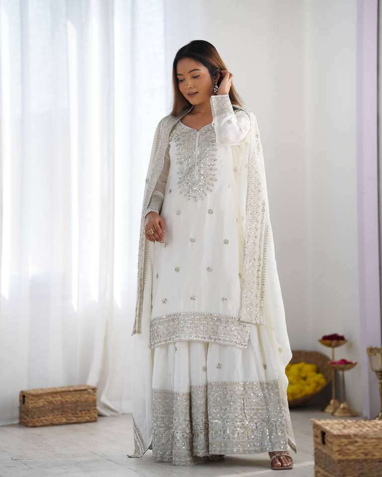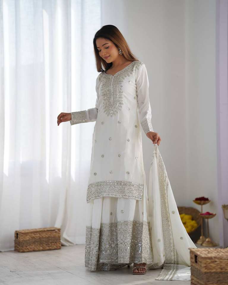 Chinnon Silk Collection with Heavy Embroidery New Fully Stitched Ready Wear Top-Plazzo Dupatta Set for Indian Pakistani Clothing