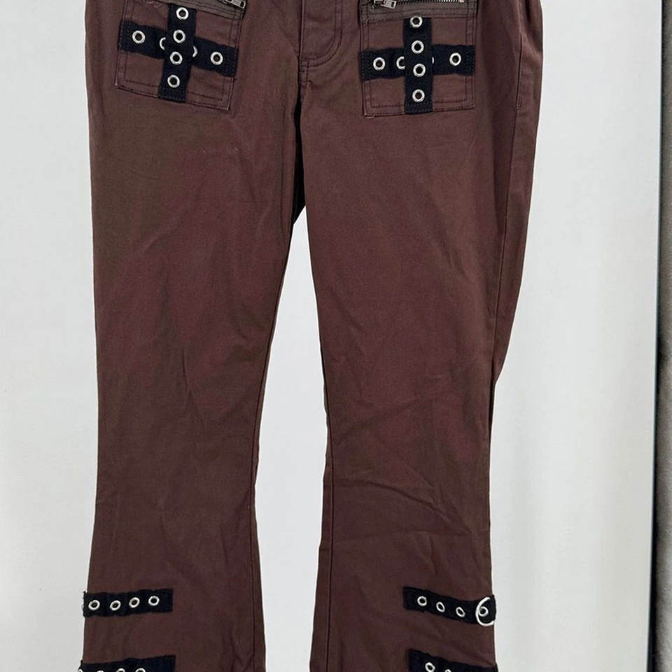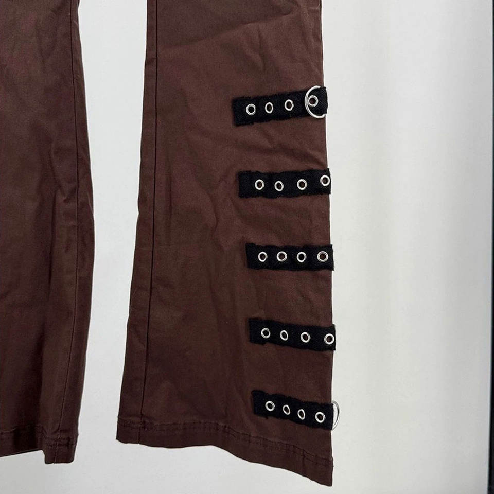 Chocolate Brown Flared Gothic Women's Pants with Contrasting Eyelet Strap Hot Item Emo Punk Concert Trousers