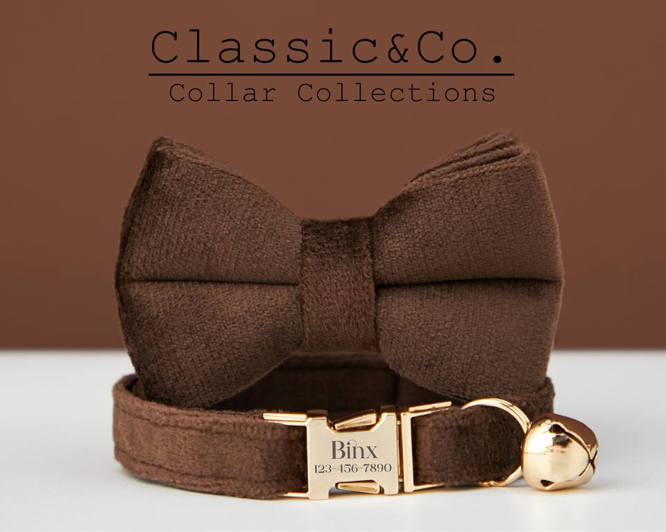 Chocolate Veet Personalized Cat & Small Dog Collar Bow Leash Set,Custom Engraved Kitten Puppy Name Tag,Free Gold Bell,Male
