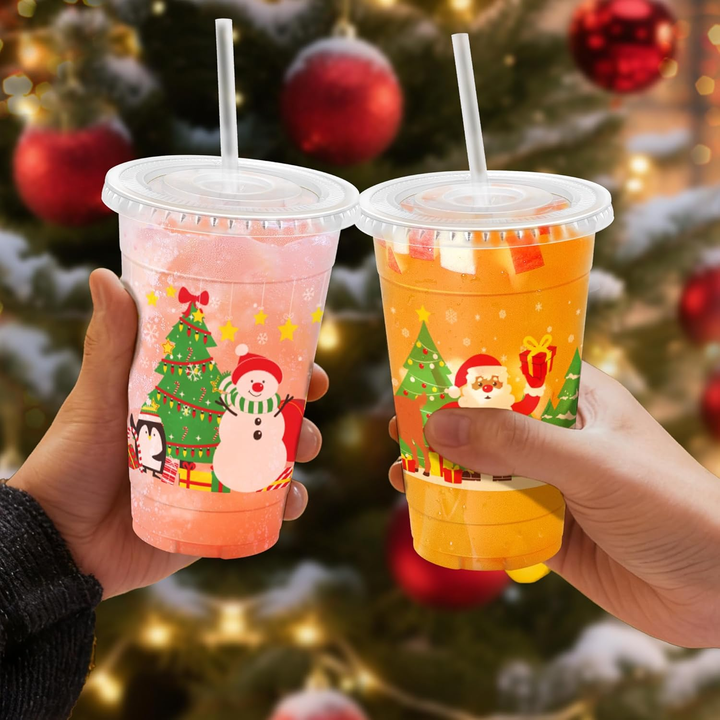 Christmas 20oz Plastic Cups with Lids and Straws Sturdy Food Safe Iced Clear Coffee Cups Disposable Smoothie Cups for Cold Drink