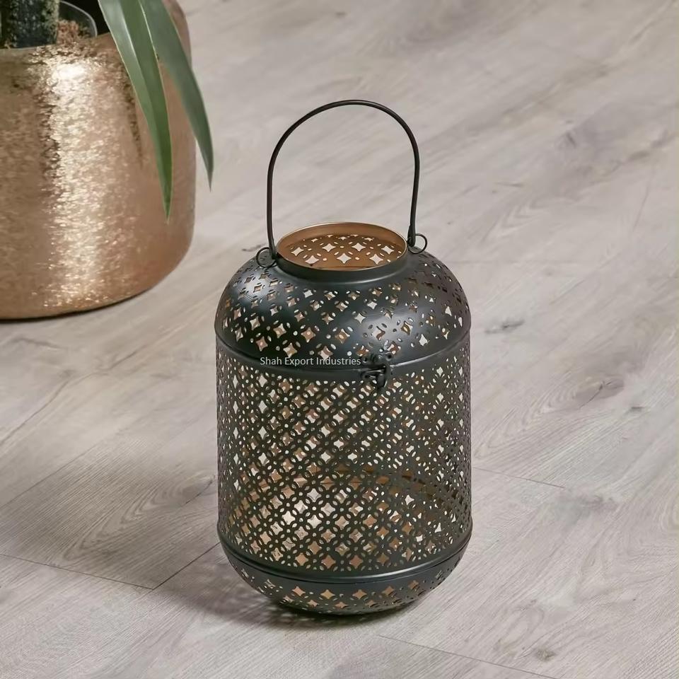 Christmas Decorative Black Coated Metal Lantern Candle Holder With Net Design for Home Garden and Wedding Decor